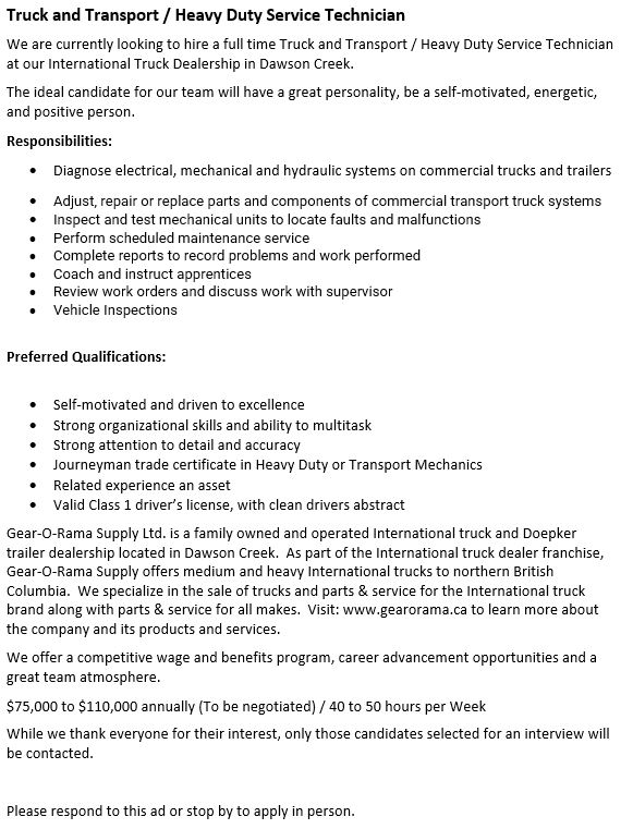 Truck and Transport / Heavy Duty Service Technician (Mechanic)